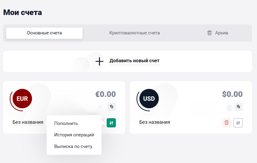 Вы также можете добавить новые счета, выбрав валюту: доллар, евро или USDT (Tether20), и доступна возможность создания крипто счета.
