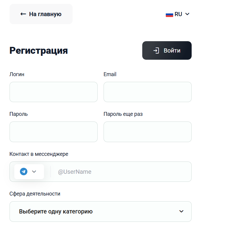 Процесс максимально простой — вам нужно придумать логин, пароль, ввести email, а также оставить свой контакт в желаемом мессенджере — Telegram, WhatsApp, Skype, Viber и указать сферу деятельности. Есть возможность подключения двойной аутентификации через Google, это быстро и безопасно!