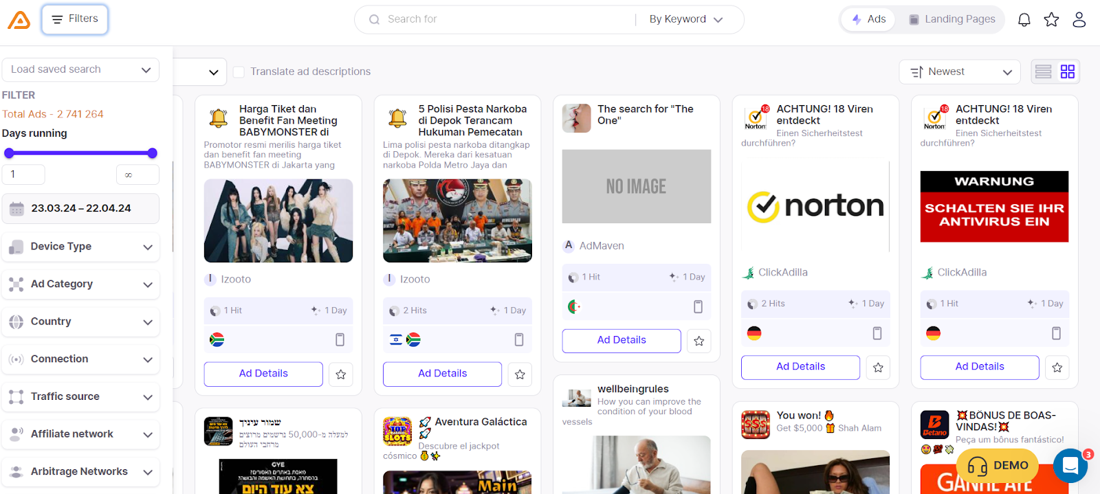 Такие инструменты позволяют использовать множество фильтров и сортировок, от ключевых слов и периода времени до стран, источников трафика и рекламных сетей. Любой арбитражник может найти там примеры пуш креативов для конкретных предложений.