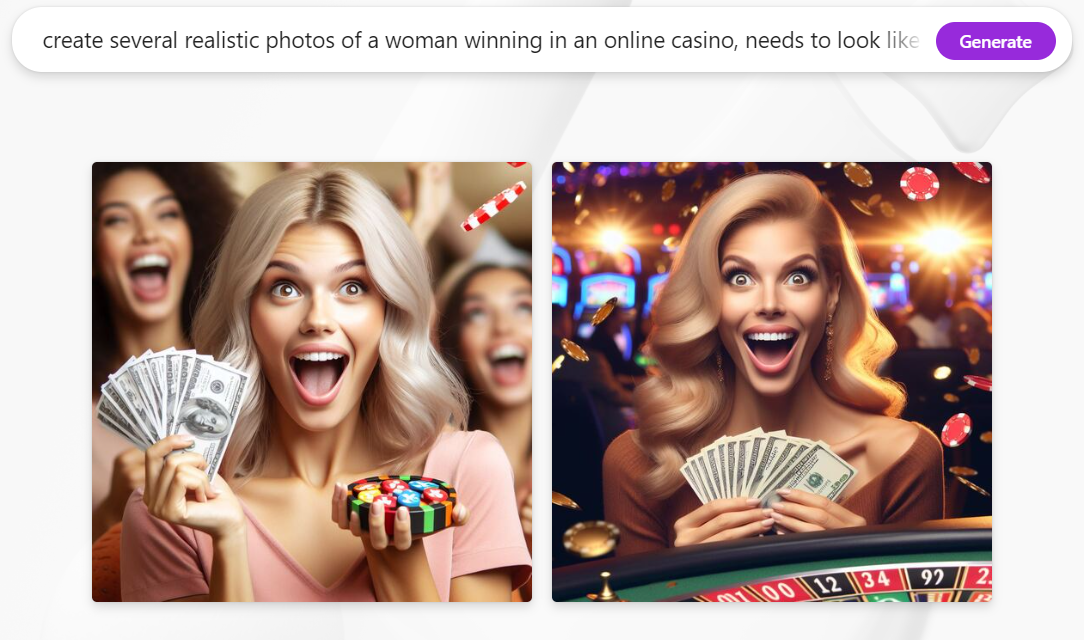 Создай несколько реалистичных фотографий женщины, выигравшей в онлайн-казино. Она очень счастлива, она выиграла джекпот. Это должно быть изображение для пуш рекламы.