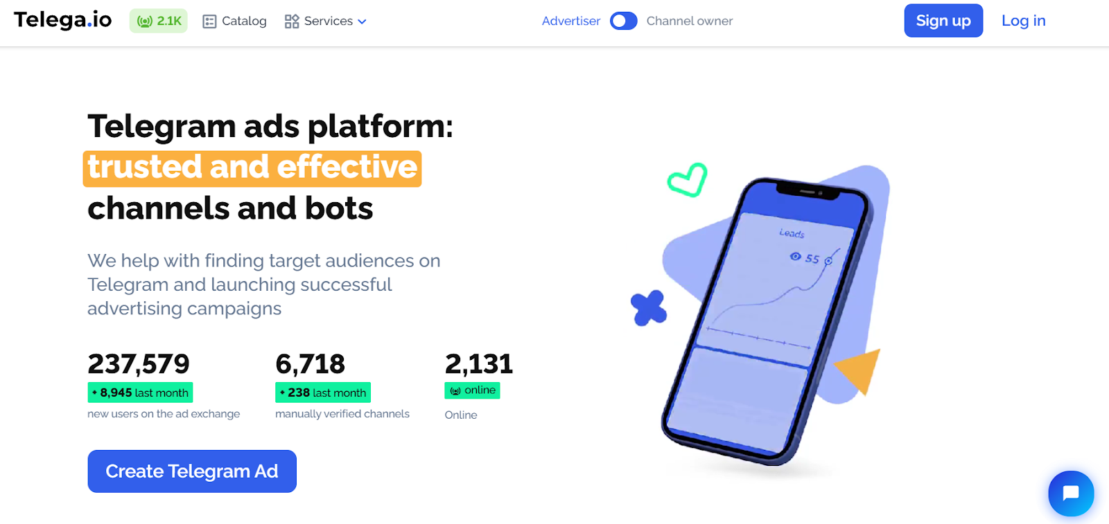 Telega — рекламная платформа, которая располагает пулом из более чем 6700 Telegram каналов. Она позволяет фильтровать поиск лучших рекламных каналов на основе количества подписчиков, рейтинга, просмотров, цены, CPM и других важных показателей.