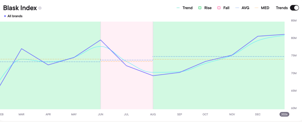 По индексу Blask мы видим устойчивое снижение спроса с явной негативной тенденцией. Это еще один важный момент, влияющий на тренды гемблинга в 2026 году: прежде, чем запускать рекламные кампании, проверьте не только спортивный календарь, но и общую ситуацию в стране. Некоторые локальные факторы могут существенно снизить вовлеченность и коэффициент конверсии.