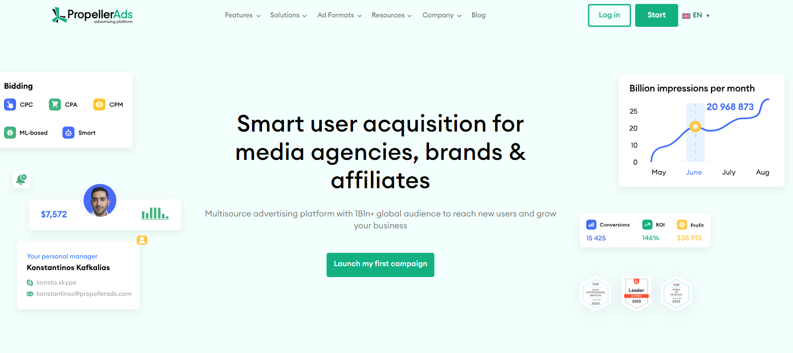 This is one more multivertical ad network, providing 12 billion impressions a day in 195+ regions worldwide. PropellerAds have been in the market for many years, focusing on Finance, Dating, Utilities, Mobile Apps, Games, Sweeps, eCommerce and iGaming niches.