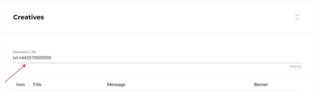 RichAds advertising platform support such campaign types. Any marketer can run ad campaigns on push ads. To do this, instead of the usual URL you can paste the phone number with the code in the following format: