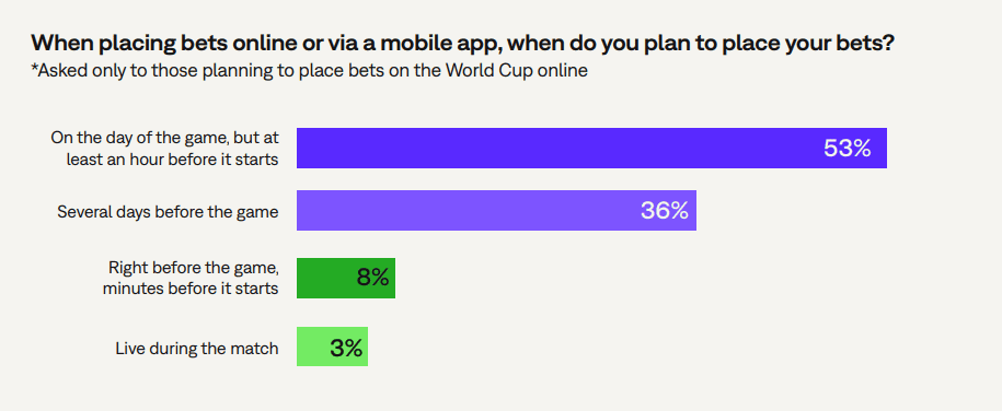 One of the most important insights for affiliates is when people actually bet. The data shows that timing is everything, as 64% of bettors plan to place their wagers on the day of the game. Plus, 36% intend to bet a couple of days in advance.